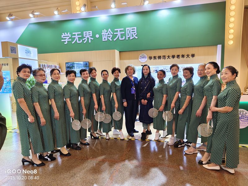2025年10月18日至20日,“学无界,龄无限”2025首届上海老年学习课程展在上海展览中心举行,华东师大老年大学携“课程+讲座+赛事+展演”重磅亮相,全方位展示华东师大老年大学富有特色的老年教育成果。其中,华东师大退休艺术团走秀队带来的旗袍秀《上海谣》,在“学习之光,点亮金色年华”上海市第十届九九重阳节展演活动中惊艳登场,用优雅姿态书写了银龄风采。