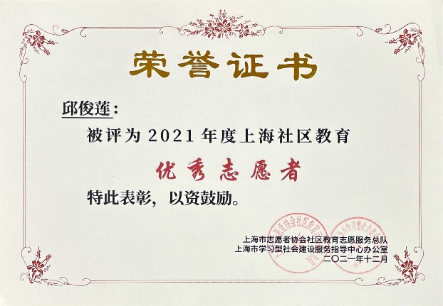 马丽华、邱俊莲老师获“2021年度上海社区教育优秀志愿者”称号